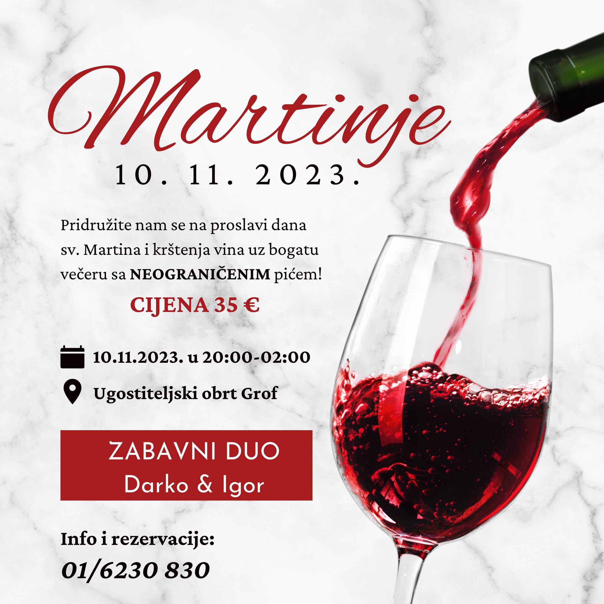 Martinje je tradicionalni blagdan koji se slavi 11. studenog. Ovaj blagdan ima duboke korijene u kršćanskoj tradiciji u mnogim katoličkim zemljama širom svijeta. Ali, u Hrvatskoj, Martinje ima svoje posebno značenje i običaje. Martinje u Hrvatskoj slavi se kao Dan mladog vina ili dan kada je mlado vino prvi put dostupno za kušanje. To je vrijeme kada se vinogradari obično okupljaju kako bi zajedno otvorili prve bačve mladog vina, poznate kao "svježe vino" ili "mlado vino". Ovaj običaj ima duboke korijene u vinogradarskoj tradiciji Hrvatske, gdje su vinogradari zahvalno slavili svoj trud i nadu u dobru vinogradarsku sezonu. Povodom Martinja naši velikogorički restorani pripremili su bogatu ponudu Martinskih menua.