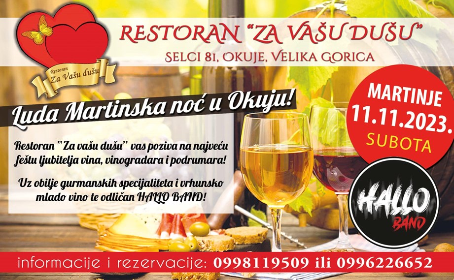 U Okuju u restoranu "Za vašu dušu" vas 11. studenog čeka luda martinjska noć uz obilje gurmanskih specijaliteta i vrhunsko mlado vino te odličan Hallo band koji će pobrinuti da nitko ne ostane sjediti za stolom. Sve informacije i rezervacije za svoje mjesto na ovoj najvećoj fešti ljubitelja vina, vinogradara i podrumara možete osigurati na brojevima mobitela 099 811 95 09 ili 099 622 66 52.