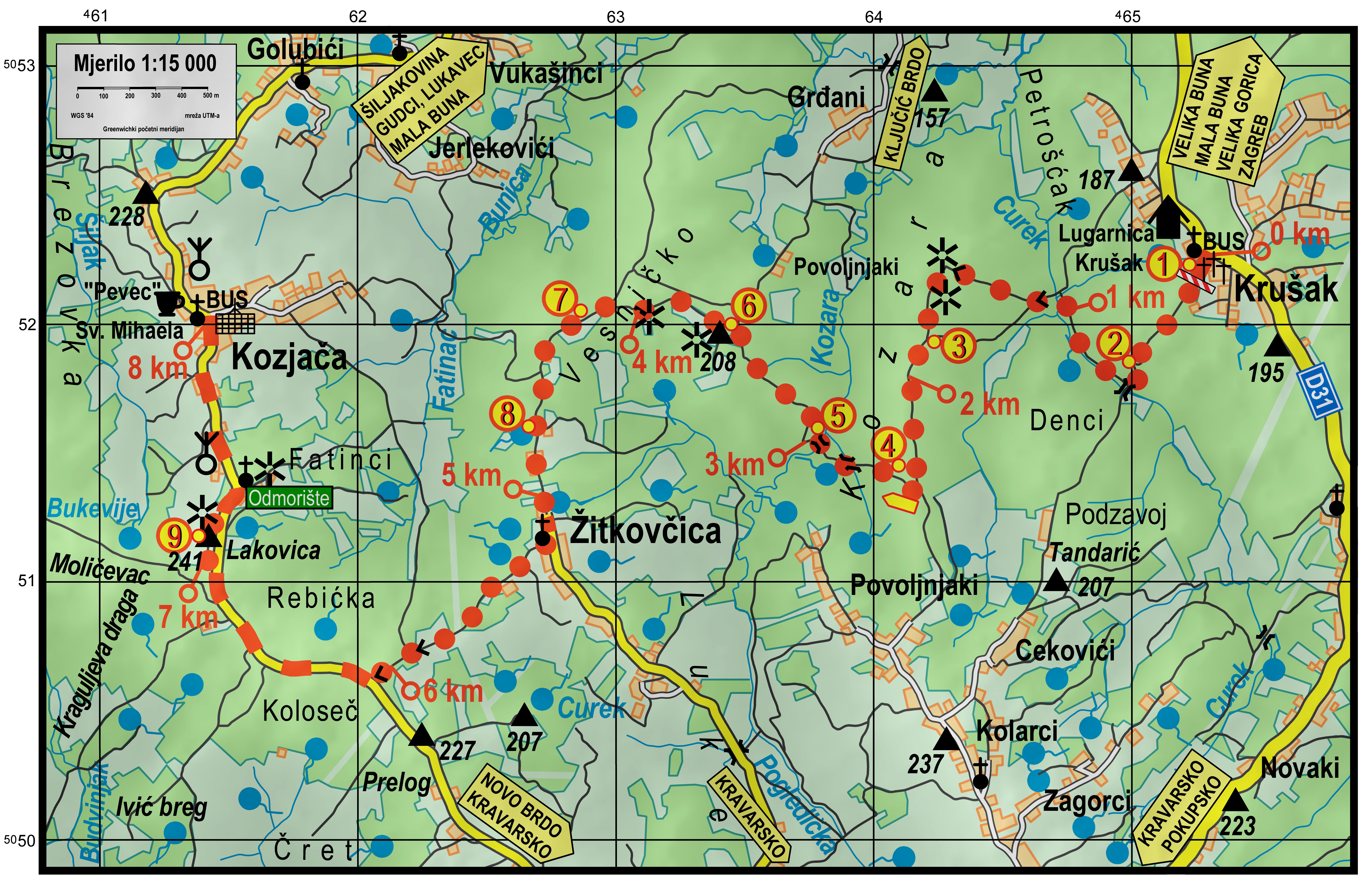 Staza prolazi kroz raznolik krajolik u kojem se izmjenjuju šumski obronci, potočne udoline, livade, vinogradi i seoski prostor. Trasa prati prirodne linije terena, uz potoke Curek i Kozara, te vodi do vidikovca Lakovica, s kojeg se pruža pogled na brežuljkasti krajolik Vukomeričkih gorica.