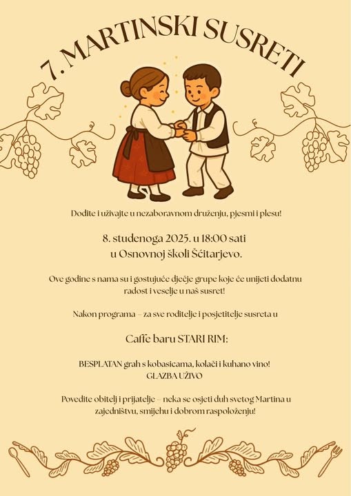 Iz Mjesnog odbora Šćitarjevo, KUD-a Šćitarjevo, caffe bara Stari Rim, Udruge umirovljenika, Društva žena i NK Mladost Obrezina pozivaju na tradicionalne, 7. Martinske susrete i proslavu Martinja koji će se održati u subotu 8. studenog u školi Šćitarjevo, a početak je predviđen za 18:00 sati.