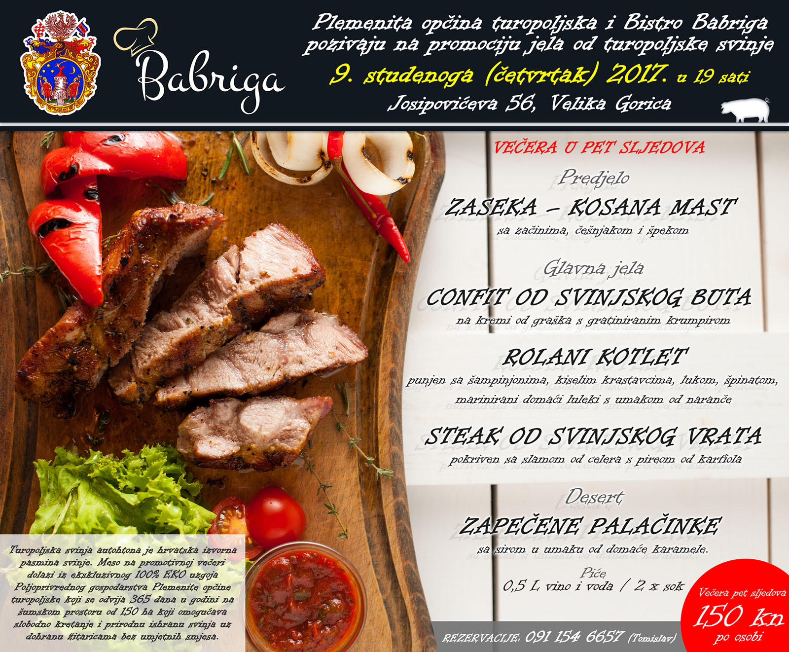 Plemenita opčina turopoljska i Bistro Babriga organiziraju promociju jela od turopoljske svinje. Gosti će imati priliku omastiti brk najfinijim turopoljskim pajcekom iz 100 posto EKO uzgoja, a očekuje vas večera u pet sljedova čija je okosnica upravo meso turopoljske svinje. Tri su glavna jela - confit od svinjskog buta na kremi od graška s gratiniranim krumpirom, zatim rolani kotlet punjen sa šampinjonima, kiselim krastavcima, lukom, špinatom uz marinirane domaće luleke s umakom od naranče, te steak od svinjskog vrata pokriven sa slamom od celera s pireom od karfiola.